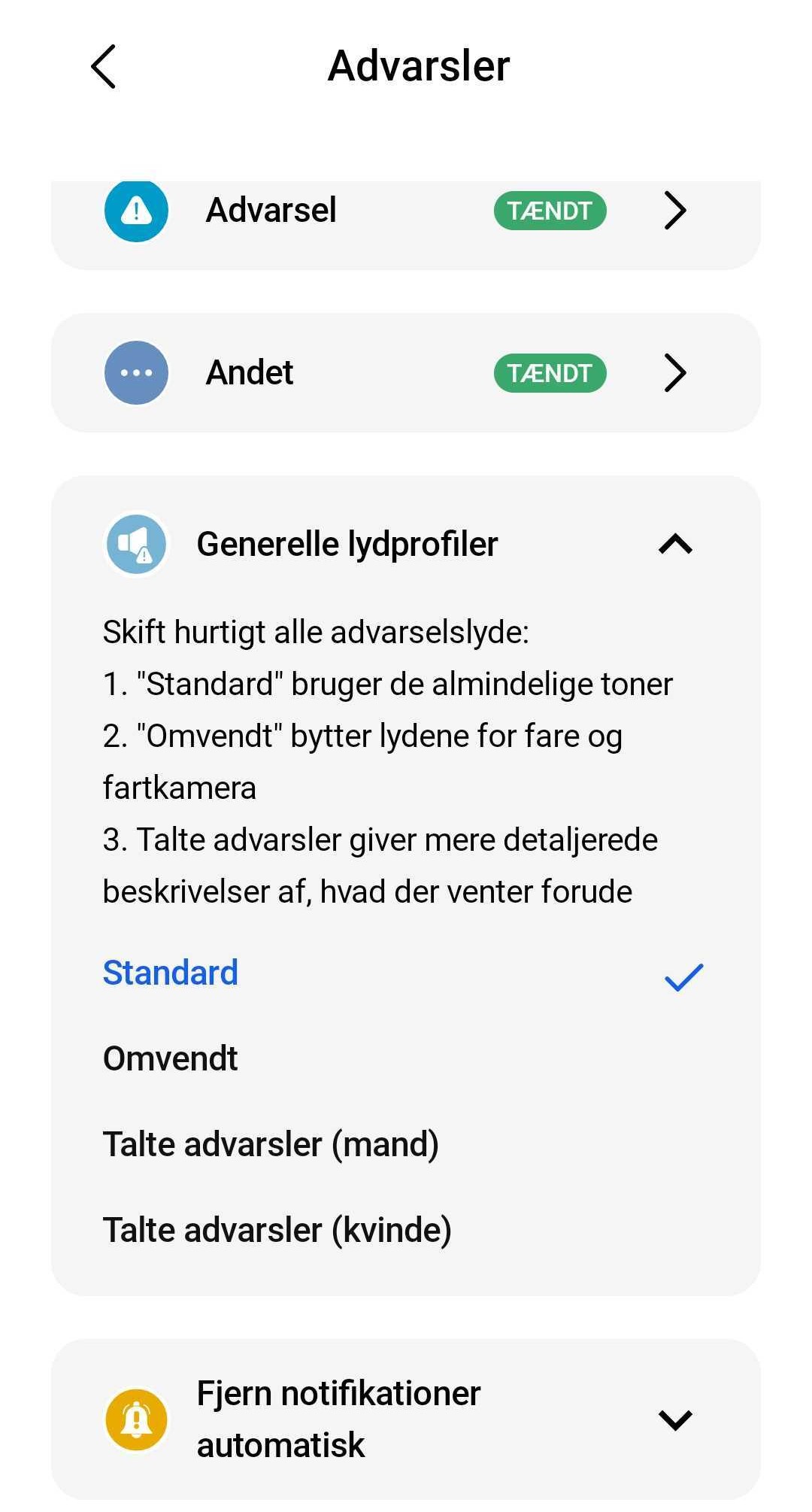 Lydprofiler er en hurtig måde at skifte alle dine advarselslyde på, på én gang. Her kan du vælge enten at bruge standard-lydene, vende lydene om (så lydene for fartkontrol bliver brugt om farer i trafikken, og omvendt), eller du kan vælge talte advarsler med enten mande- eller kvindestemme.
