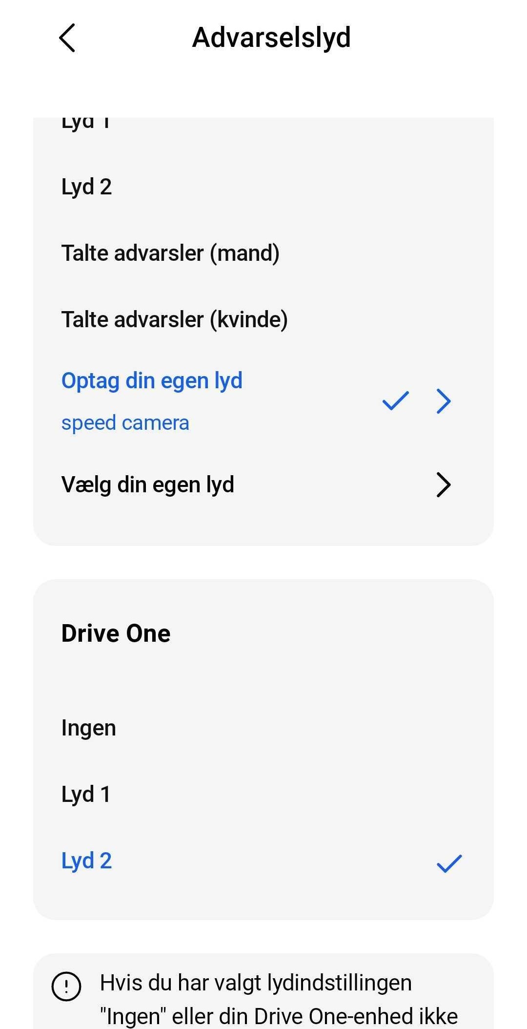 Som noget ekstra sjovt kan du optage din egen advarselslyd. Det kan fx være en sjov besked fra din ven eller kæreste. Dine egne lyde optages direkte i Drive One- appen ved at gå ind i hver enkelt advarsel, du vil ændre > Advarselslyd > Optag din egen lyd og følge guiden derfra.