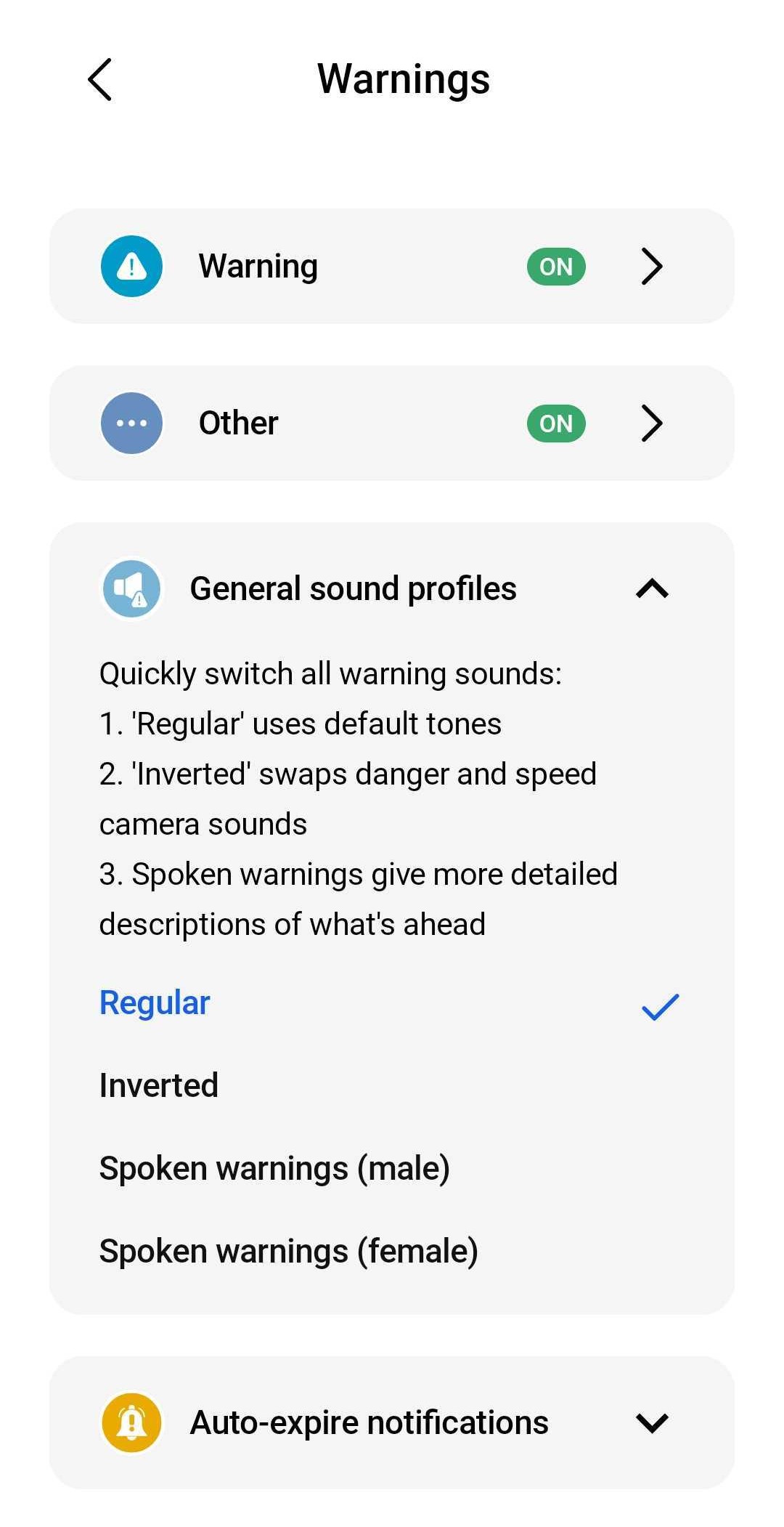 Sound profiles are a quick way to change all your warning sounds at once. Here you can choose to use the standard sounds, swap the sounds (so that speed control sounds are used for traffic hazards and vice versa), or choose spoken warnings with either a male or female voice.