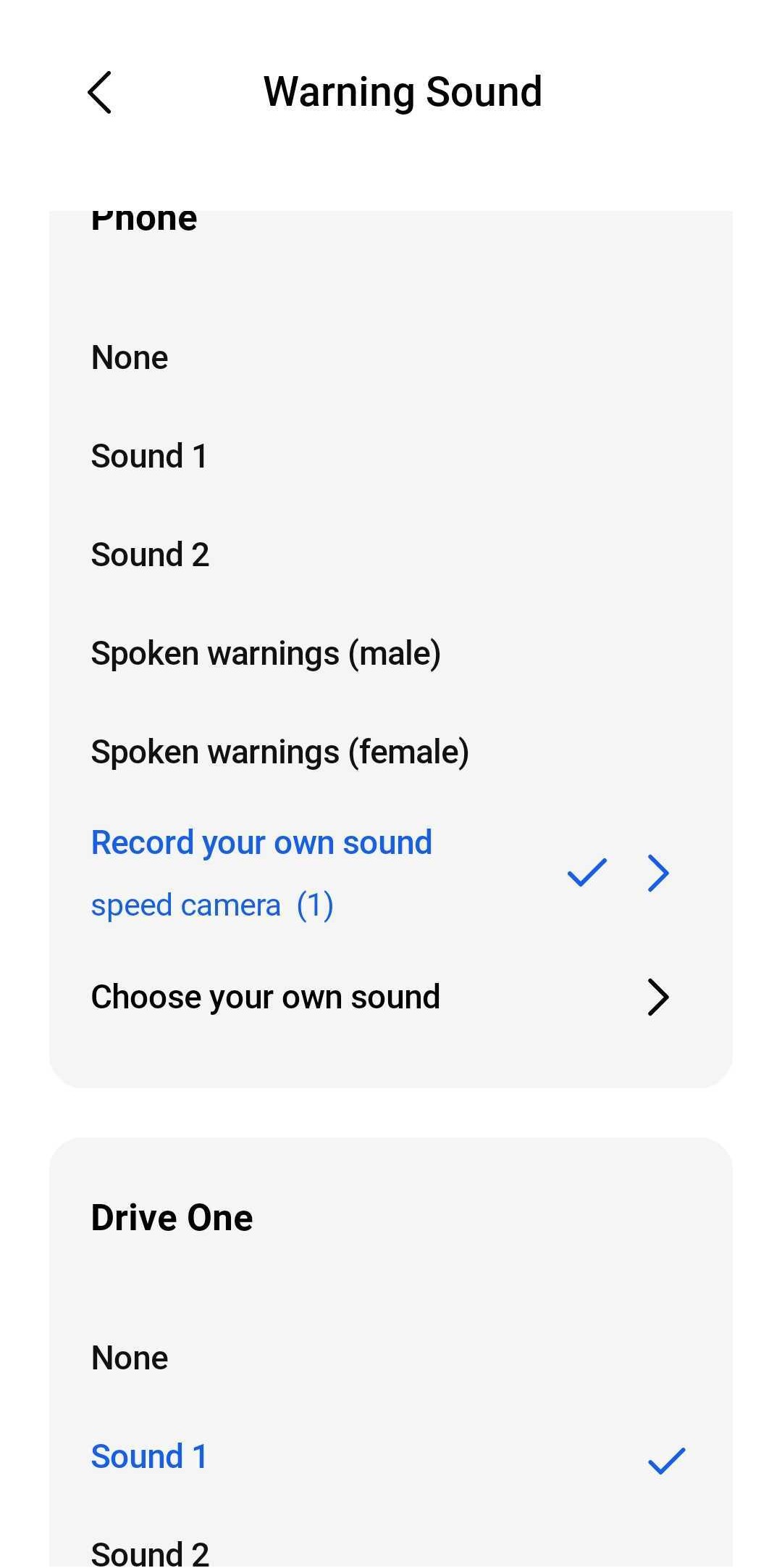 For a bit of fun, you can record your own warning sound — for example, a funny message from a friend or your partner. Your own sounds can be recorded directly in the Drive One app by going into each warning you want to change > Warning sound > Record your own sound and following the guide from there.